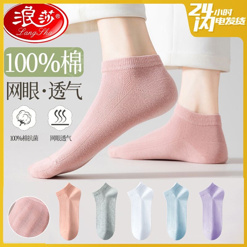 浪莎袜子女短袜夏季薄款100%纯棉防臭女士短筒棉袜春秋彩色女船袜