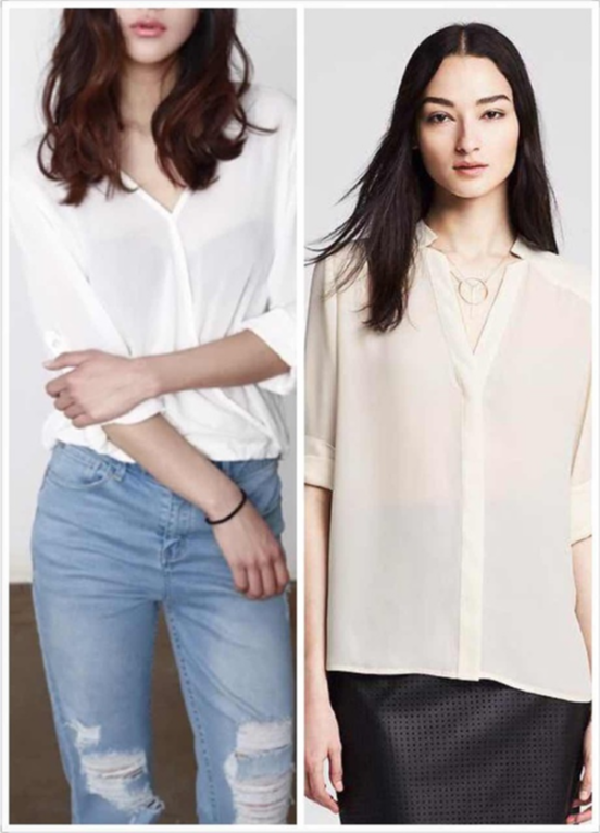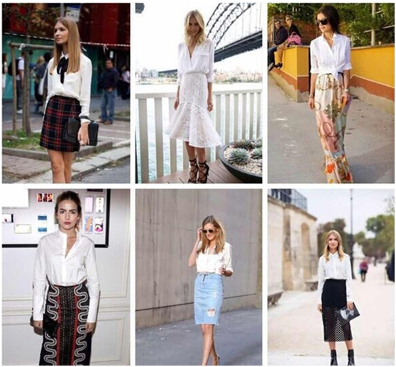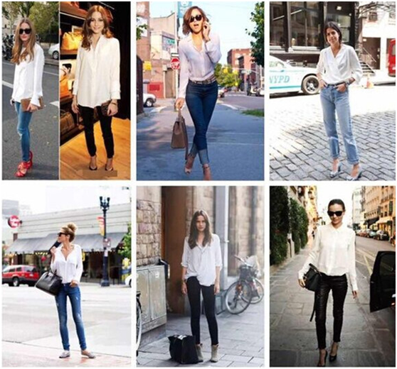 1 .第一个肯定是白衬衫。米白和裸粉是相对安全的选择。好多妹子说白衬衫不适合自己,可能是没有选对。单穿下身配任何紧身裤绝对不会出错;换宽松的破洞牛仔裤平底鞋就是休闲风格;外面套件小西装妥妥职场范无压力;还可以配休闲裤、半身裙