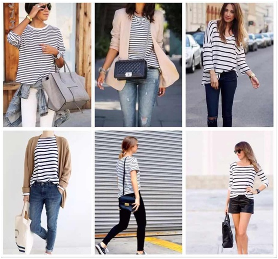 3.条纹T恤。这个也是百搭长袖短袖各一件。单穿或打底搭配神马外套针织衫都可以。