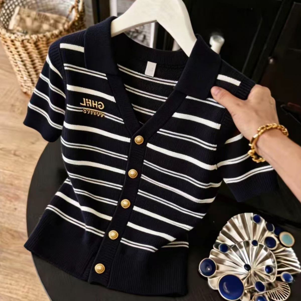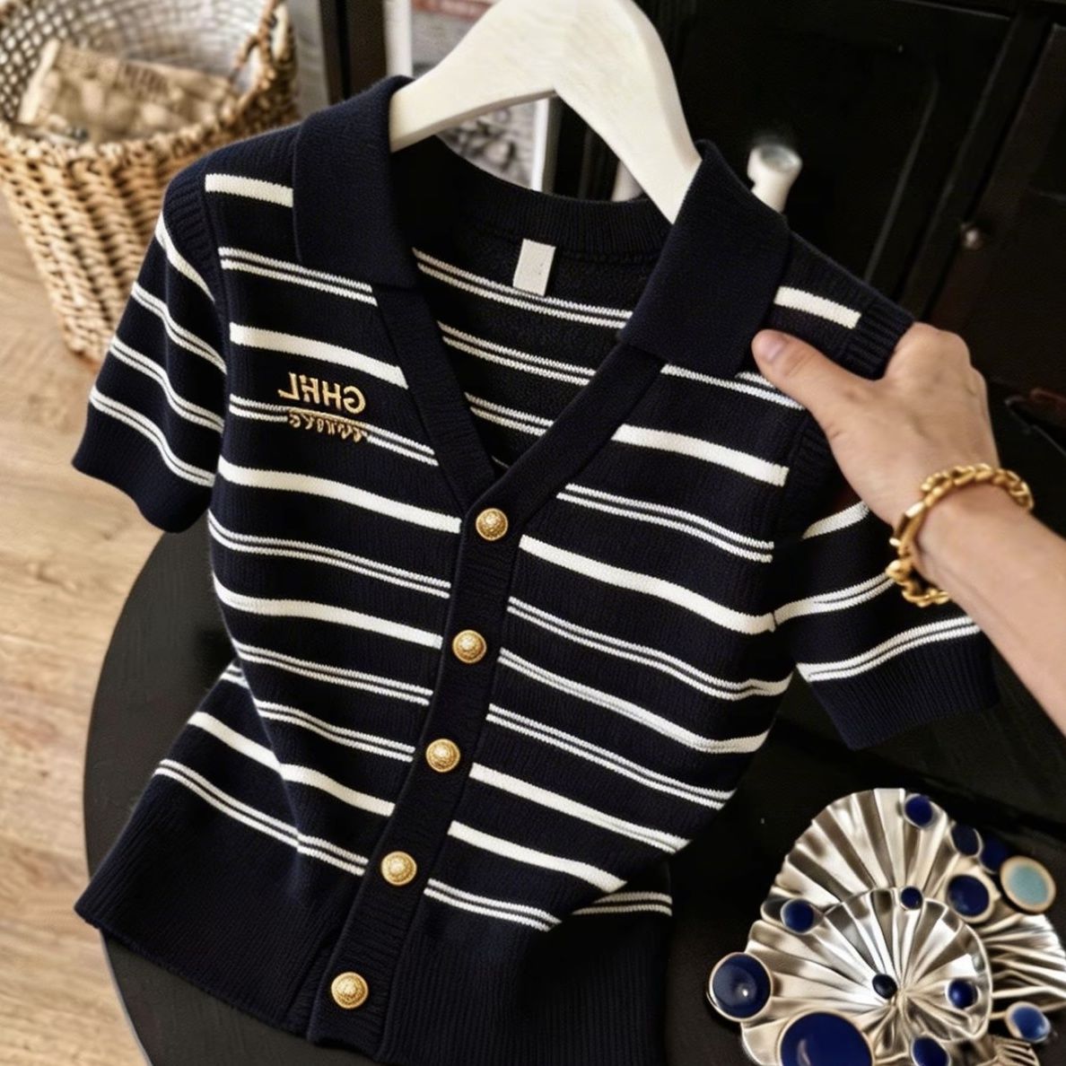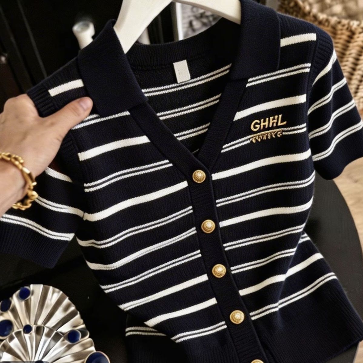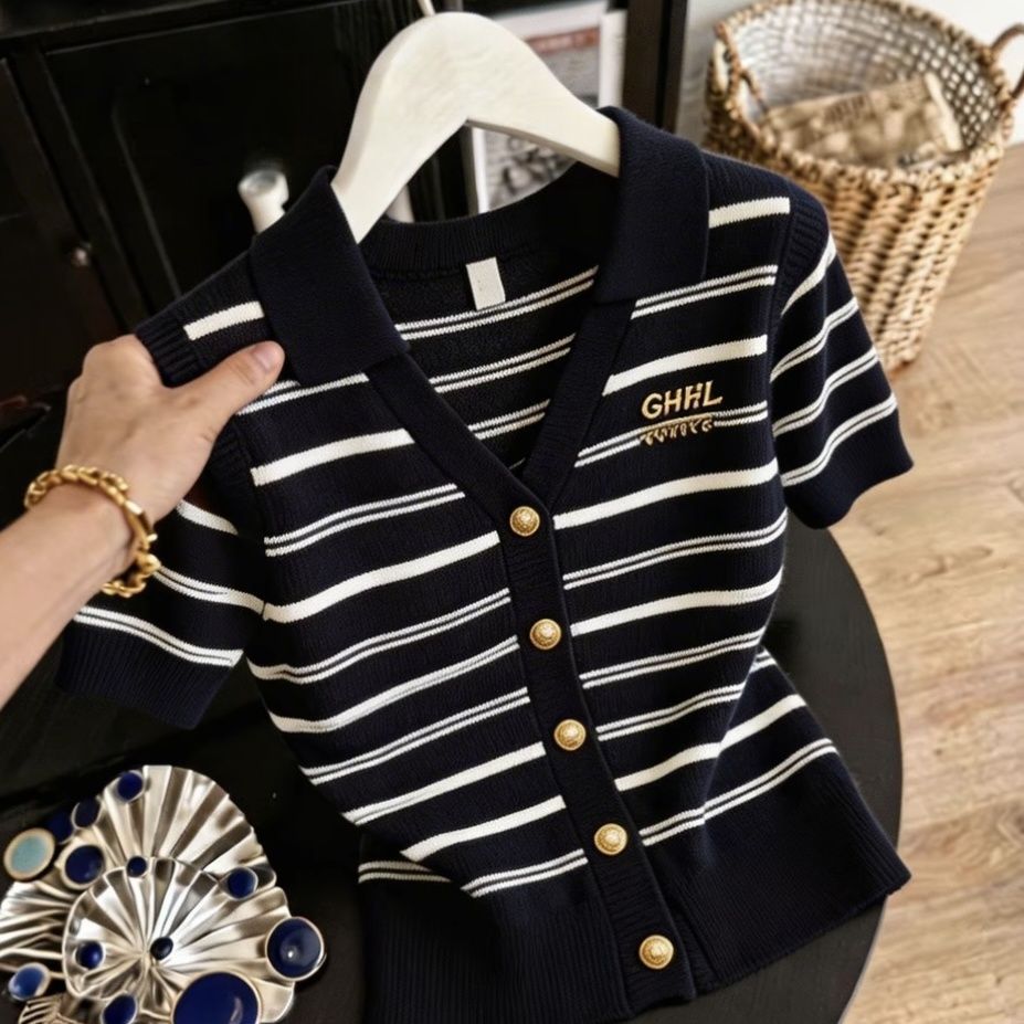 小众2026夏季新款(80-200)大码撞色条纹polo领轻奢翻领短袖针织衫【7天内发货】